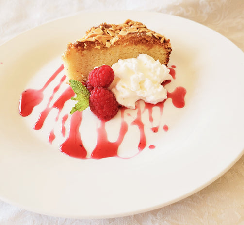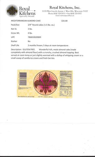 Two 9" round cakes per order. 1.5lbs each. Gluten free, rich, and moist almond cake is the perfect compliment to any meal! Made completely with almond flour, fresh eggs, and sugar. Topped with crushed almonds for a crunchy finish! Serve with a dollop of whipped cream or fresh fruit, and a scoop of vanilla ice cream and voila! You're a pastry chef genius!